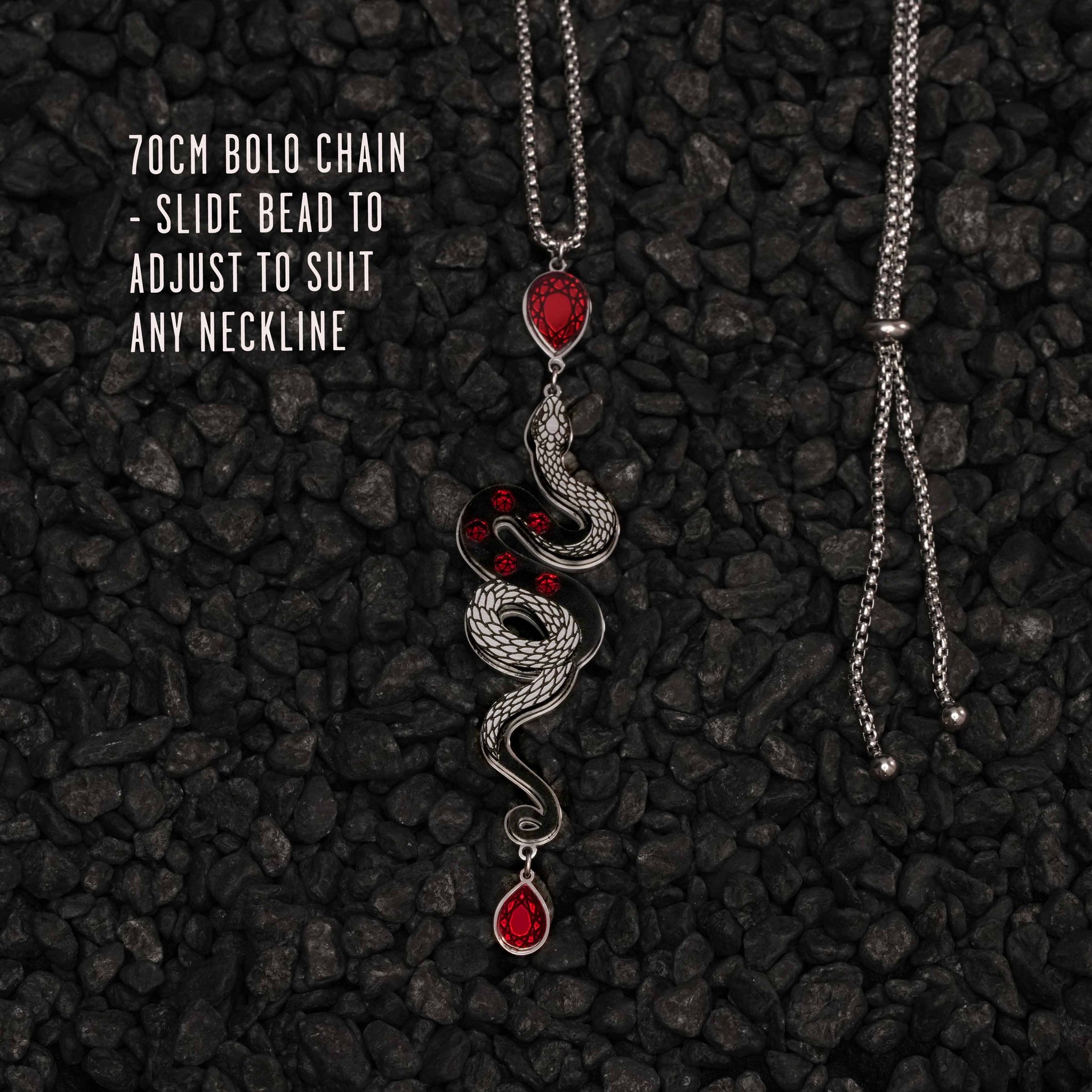 A coiled stainless steel serpent wraps around deep onyx marble, pierced with ruby-red accents that burn like quiet fire. The 70 cm adjustable bolo chain lets you shift your look from layered edge to sleek minimalism with ease.