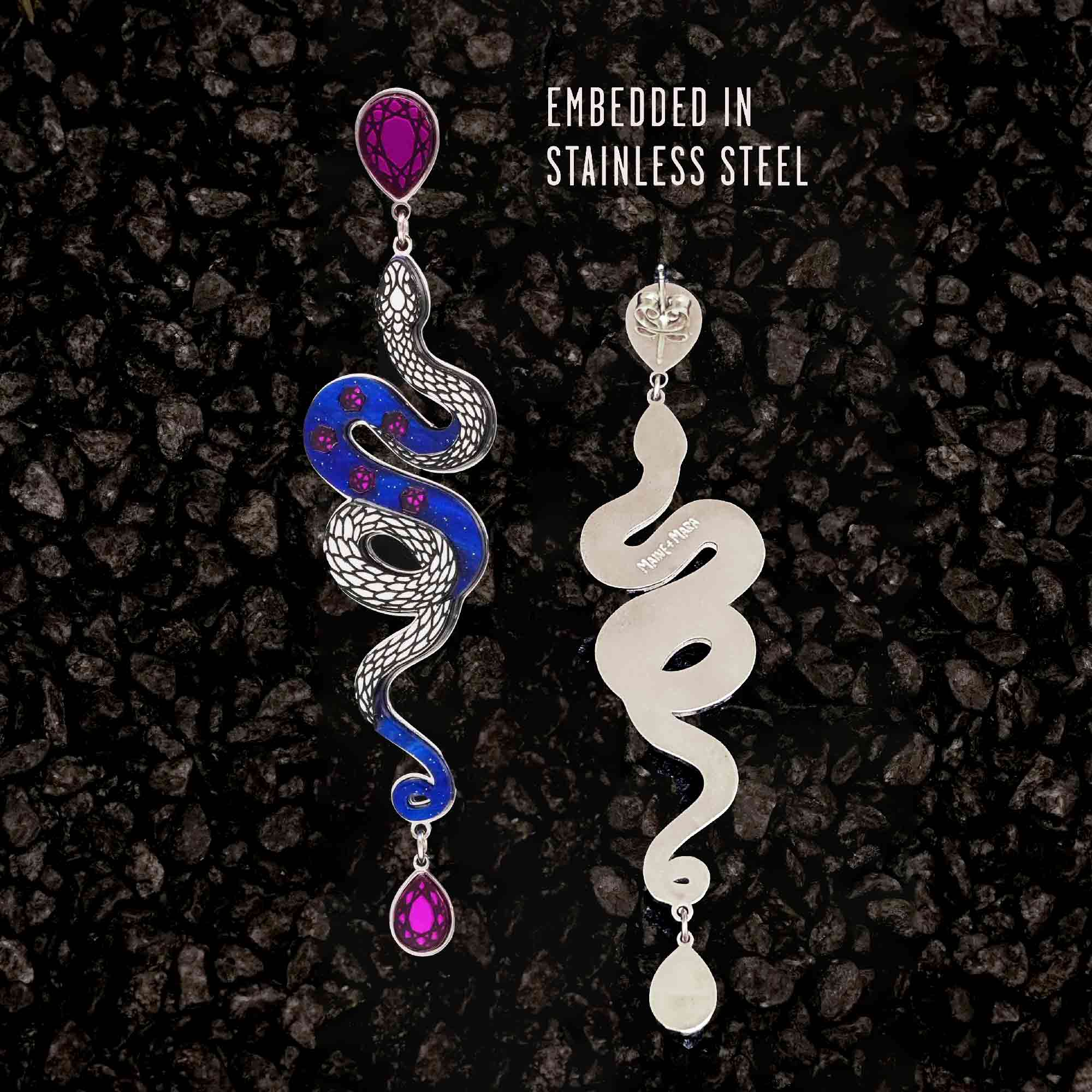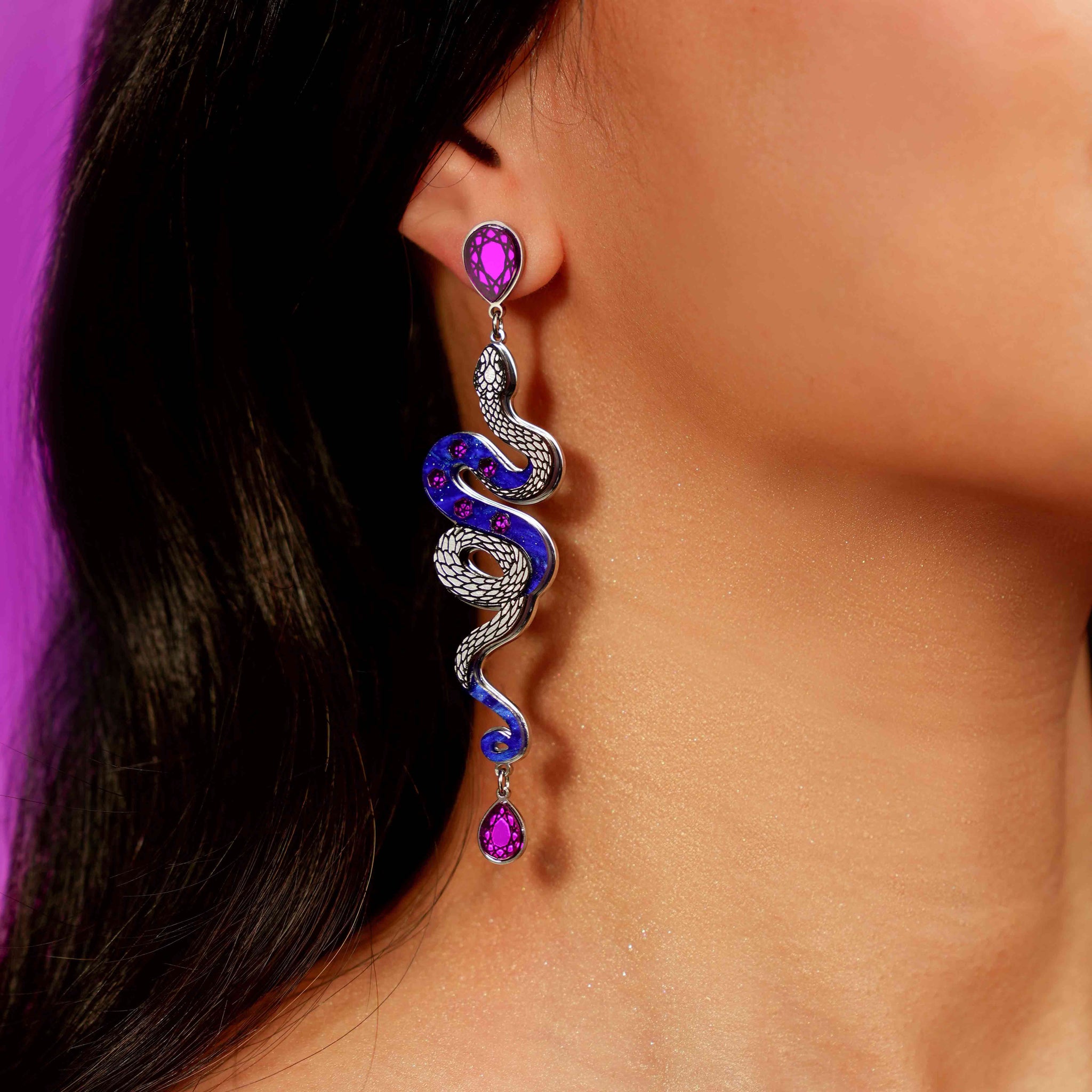 Fearless yet refined, these earrings feature amethyst purple gem drops suspended from serpentine snakes in swirling amethyst purple and midnight blue marble. Each tail tip sparkles with a tiny gem that catches the light — a wearable symbol of strength, renewal, and allure.